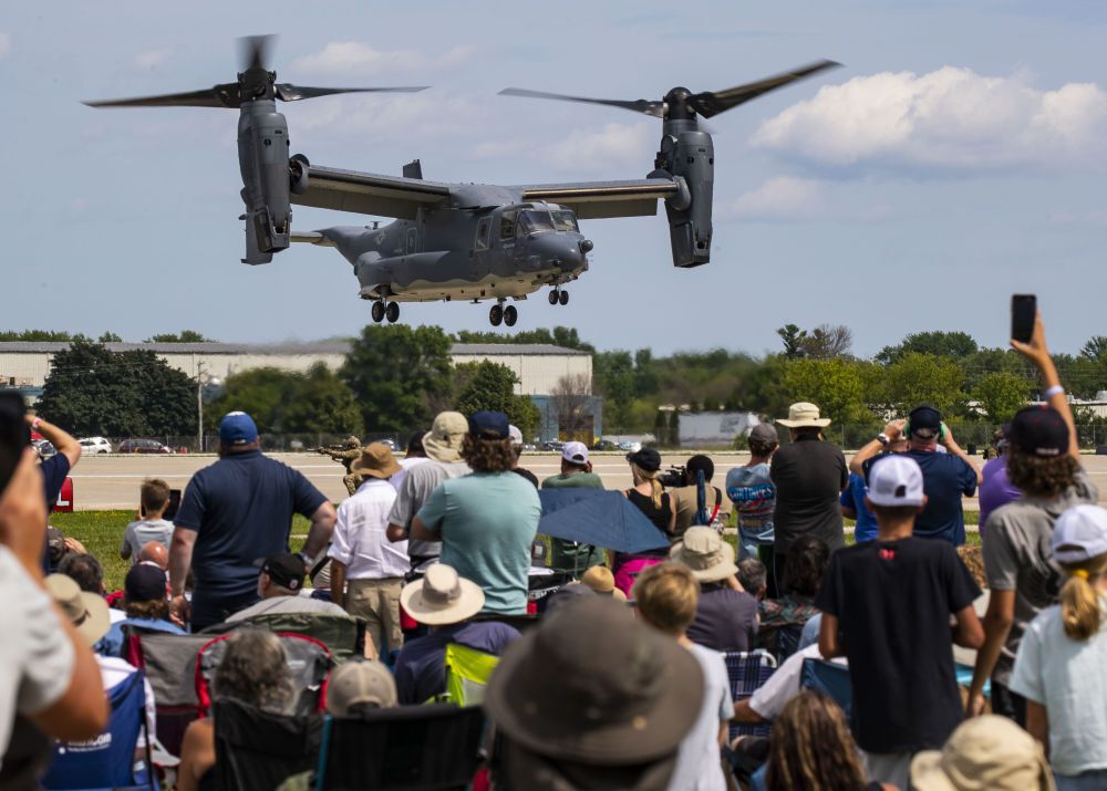 2021年7月30日,在美国威斯康星州奥什科什,一架V-22鱼鹰式倾转旋翼机在“飞来者大会”上展示其悬停能力。新华社发(乔尔·莱纳摄)