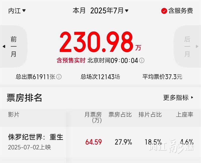 据了解,7月以来,《侏罗纪世界:重生》《超人》《聊斋:兰若寺》《罗小黑战记 Ⅱ》《花漾少女杀人事件》《长安的荔枝》等多部新片密集上映,不仅让暑期电影市场内容丰富起来,也给观众提供了更多元的选择。相关数据显示,截至2025年7月21日上午9时,内江7月已排映电影12143场,总出票61911张,累计票房达230.98万元(含实时预售)。