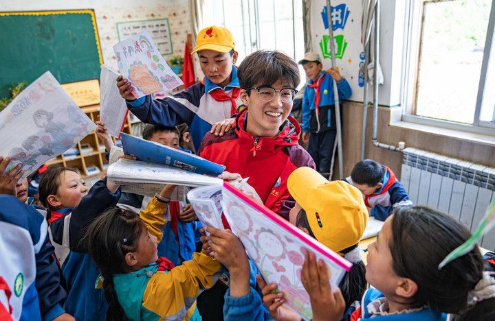 西藏林芝市工布江达县娘蒲乡中心小学地处海拔近4000米的高原,是布江达县海拔最高的学校。持续性的对口教育援藏工作有力补充了专业师资力量,改善了学校硬软件设施设备。这是2024年9月3日,西藏林芝市工布江达县娘蒲乡中心小学的孩子们,把自己做好的手抄报展示给岭南师范学院支教队队员胡正培。