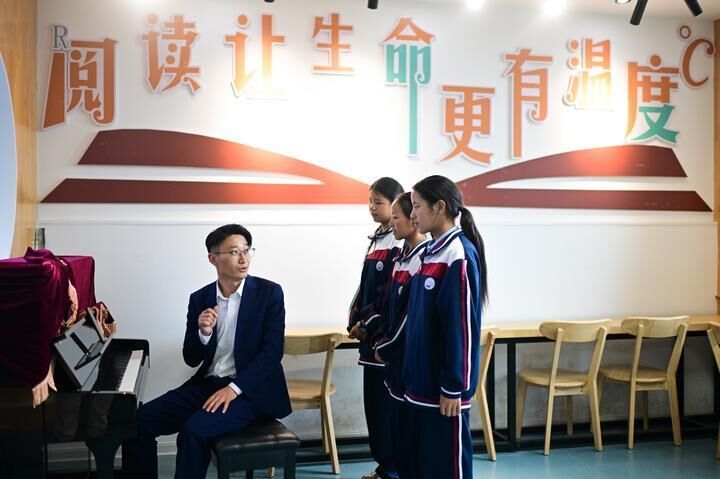 2024年6月18日,上海援青教师阚延俊在位于西宁的果洛西宁民族中学给学生上音乐课。果洛西宁民族中学是一所沪青共建学校。学校招生以来,上海援青团队落实各类教育资金,改善校园面貌,引入先进教育理念,带动整体办学水平和教育教学质量不断提高。