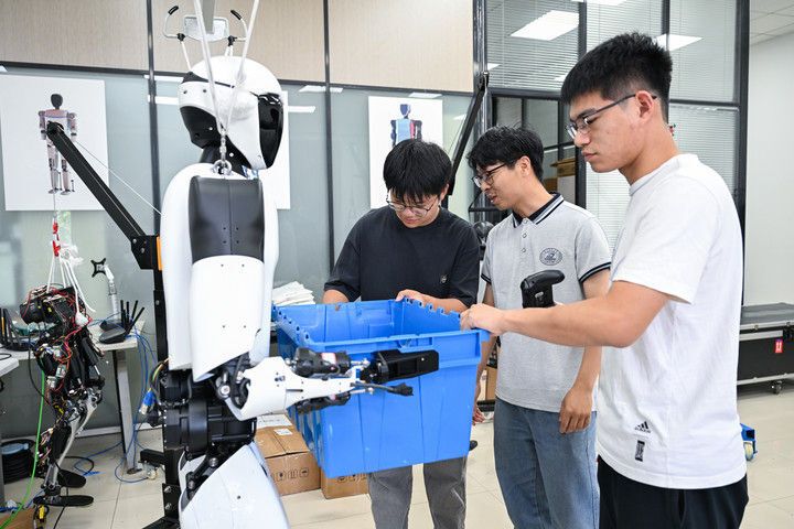 近年来,湖北省加快布局人形机器人领域,依托省内高校院所的人才优势和创新体系优势,组织武汉大学、华中科技大学等参与人形机器人相关项目研发,集中推出“天问”“劳动者”“荆楚”等一系列人形机器人。这是2025年5月29日,在华中科技大学机械科学与工程学院,博士研究生丁涛(右二)和团队成员测试“荆楚”人形机器人的搬运能力。