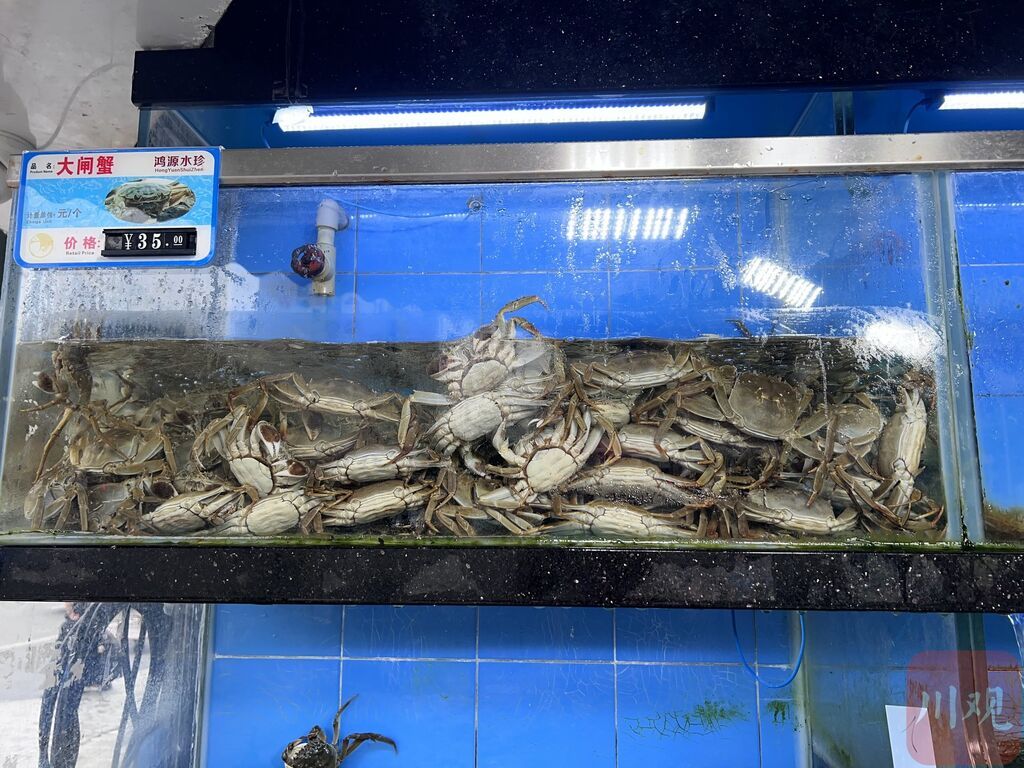 9月15日15时,成都青石桥市场大门口的鸿源水珍青石桥店已经有不少市民前来选购食材。记者看到,本该占据“首席”的大闸蟹没有摆在显眼位置,而是缩在边缘处的水缸中。