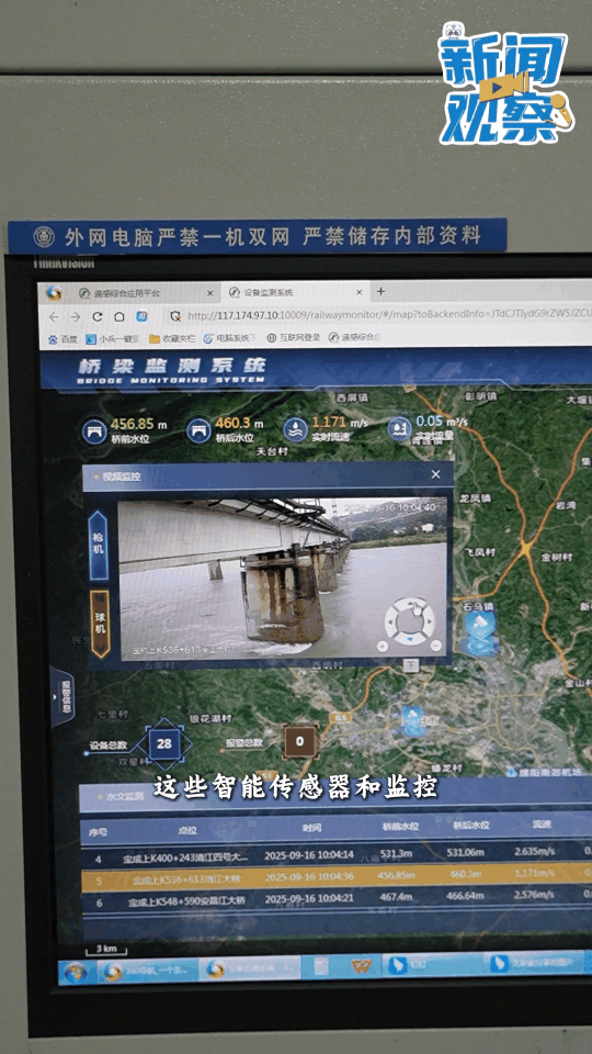 中国铁路成都局集团有限公司绵阳工务段桥隧技术科桥隧工 赵健佳:“这边是安装在桥墩上的实时监控,这边是对桥墩位移坐标监测,这些智能传感器和监控能24小时不间断监测桥墩位移、水位变化,这些数据会自动上传到平台,我们坐在监控室就能掌握桥梁状态。一旦数据超了安全值,系统马上报警,我们就能第一时间封锁线路、上桥排查,隐患处置比以前快多了!”
