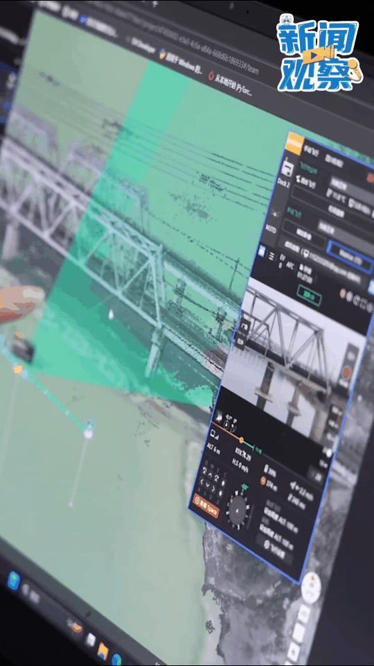 记者鲁文林:“除了这些固定的智能装备,每座铁路桥还升级了巡检模式。大家看,地面有工作人员细致的排查,天上还有一双眼睛覆盖桥梁全域,‘空地联动’能及时发现桥面积水、部件松动这些汛期隐患。”