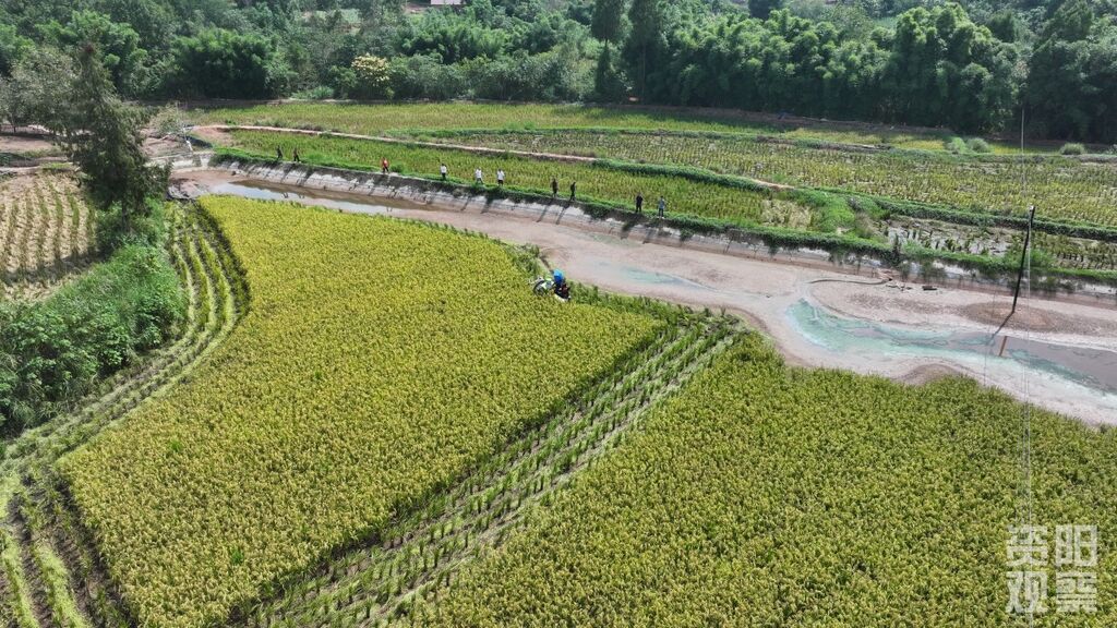 9月15日,晴空万里。资阳市雁江区小院镇桅子湾村一片金黄。李能齐头戴遮阳伞,熟练地操控着收割机从田边起步,一圈圈、一行行有序推进,饱满的稻谷被尽数收入袋中,在稻田里留下整齐的轨迹。