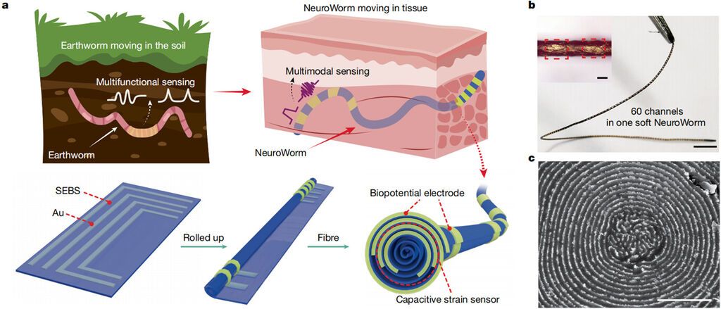 研究团队受蚯蚓在土壤中灵活运动和分段感知能力的启发,通过精巧的电极结构设计和卷曲技术,将制备在超薄柔性聚合物上的二维电极阵列卷曲成一根直径仅约200微米的纤维。这根纤细的神经纤维电极沿轴向集成了多达60个独立的生物电信号采集通道。研究人员在纤维头部嵌入了一个微小的磁控单元,使得植入后的“神经蠕虫”能够在外部磁场的引导下,在脑组织或肌肉上等软组织中主动前行、转向,精准抵达目标区域进行动态监测。