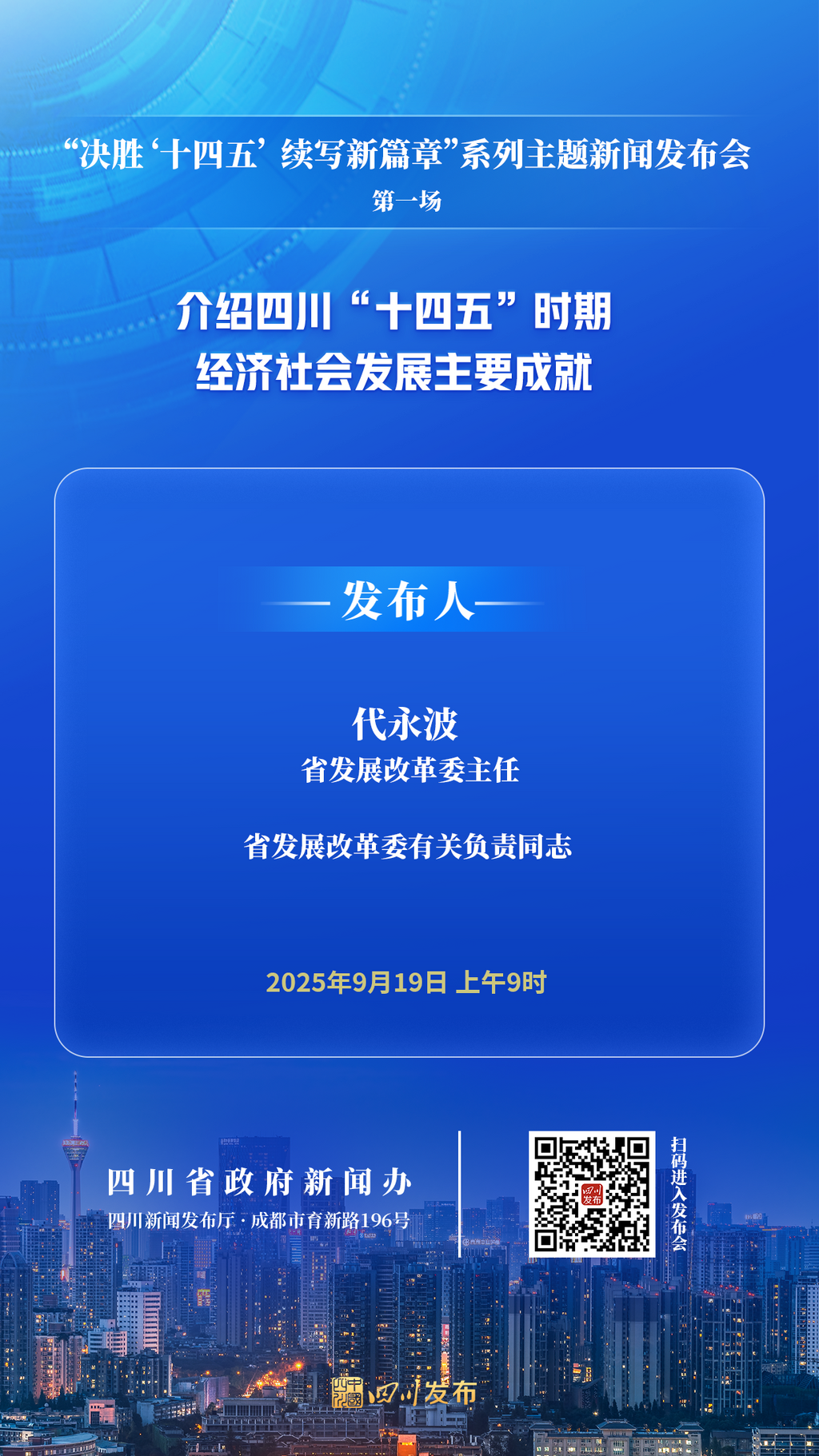 2025年9月19日(星期五)9:00,省政府新闻办将在四川新闻发布厅举行“决胜‘十四五’ 续写新篇章”系列主题新闻发布会第一场,省发展改革委主任代永波围绕四川“十四五”时期经济社会发展主要成就作介绍并答记者问,省发展改革委有关负责同志参加答记者问。四川发布客户端将全程图文直播,敬请关注!