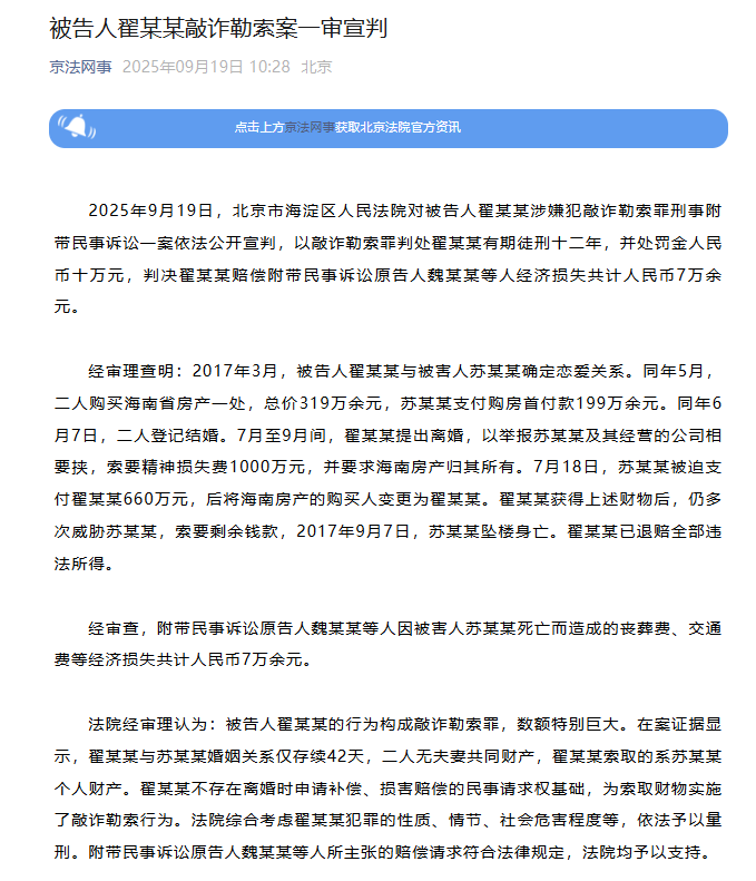 2025年9月19日,北京市海淀区人民法院对被告人翟某某涉嫌犯敲诈勒索罪刑事附带民事诉讼一案依法公开宣判,以敲诈勒索罪判处翟某某有期徒刑十二年,并处罚金人民币十万元,判决翟某某赔偿附带民事诉讼原告人魏某某等人经济损失共计人民币7万余元。