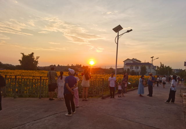 成都游客李女士一边拍摄一边感叹:“在花海边吃坝坝宴,远处是夕阳河流,能在七夕节体验到这份浪漫,我要多拍照记录,让朋友都羡慕!”