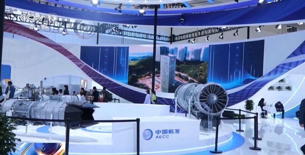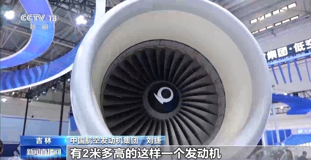 在中国航空发动机集团展区,一台巨大的明星国产发动机实物就摆在展台入口。