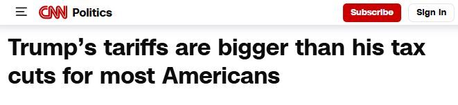 美国有线电视新闻网(CNN)援引耶鲁预算实验室的最新分析指出,对大多数美国家庭而言,关税带来的额外成本远超减税所带来的收益。数据显示,受当前关税政策影响,美国家庭平均每年可能多支付2300美元,几乎是减税政策带来的人均约800美元减免额的三倍。该机构政策分析副主任约翰·里科表示:“对于美国家庭整体而言,关税导致的税负增加超过了减税带来的节省。”