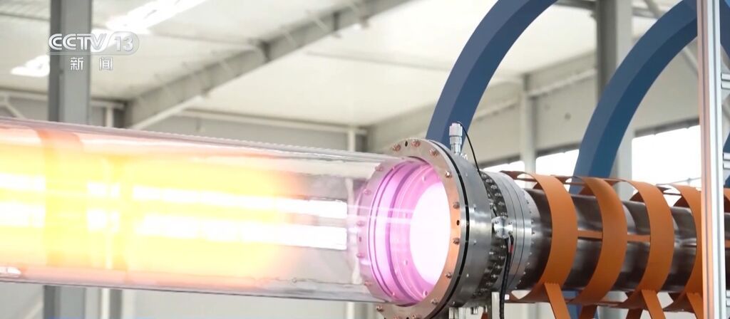 在四川成都这个产业园的厂房内,一套全新的核聚变研发装置样机已经搭建完成。这个20米长像圆桶一样的装置有一个专业的名字叫“直线型场反位型聚变装置”。现在,设备已经被实验气体形成的等离子体充满,等待放电。
