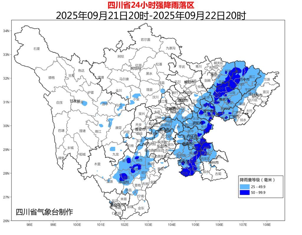四川省气象台15时40分发布暴雨蓝色预警。9月21日20时到22日20时:巴中、南充、遂宁、资阳、内江、自贡、宜宾、眉山8市,达州、广安2市西部,广元、绵阳、德阳、成都4市东部,泸州、乐山2市北部及凉山州中部北部有大雨到暴雨(雨量40~80毫米),局地大暴雨(雨量100~120毫米),最大小时雨强20~40毫米;冷空气影响时,盆地中部北部有4~6级偏北风,局部可达7级或以上。