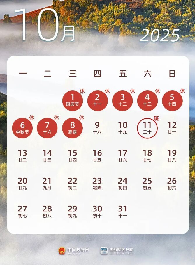 国庆中秋假期:10月1日至8日放假调休,共8天。9月28日(周日)、10月11日(周六)上班。所有收费公路(含机场高速、收费桥梁和隧道)免征小型客车通行费。10月9日0时起,恢复正常收费。