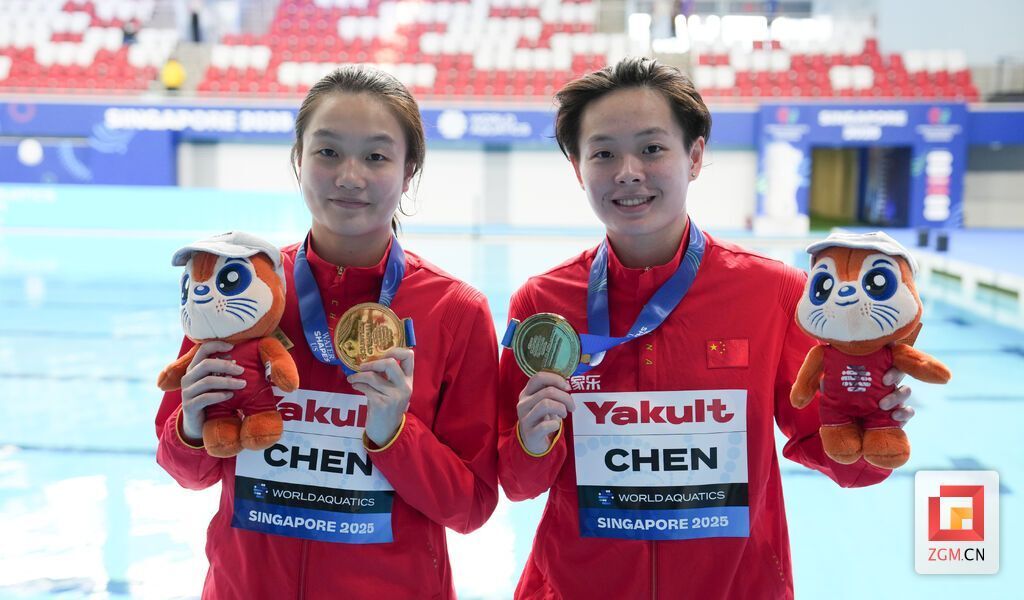 陈佳(左)和陈艺文在2025年世界游泳锦标赛跳水女子双人3米板决赛中夺冠(资料图片)