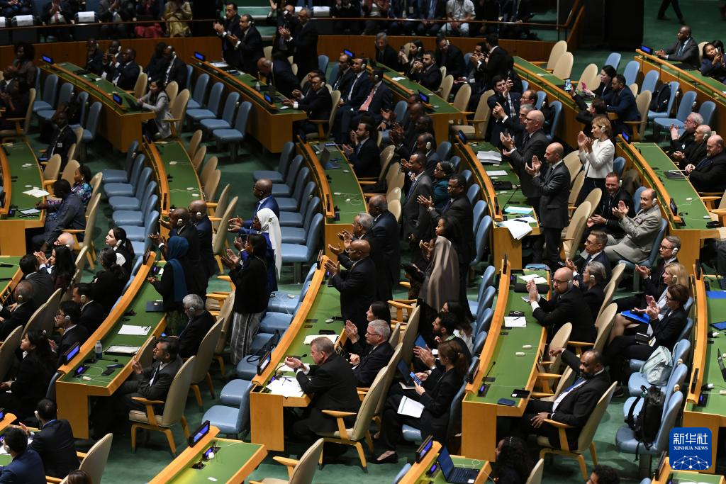 9月22日,在位于纽约的联合国总部举行的和平解决巴勒斯坦问题和落实“两国方案”高级别国际会议上,法国总统马克龙发表讲话时,与会代表鼓掌。新华社记者 李睿 摄
