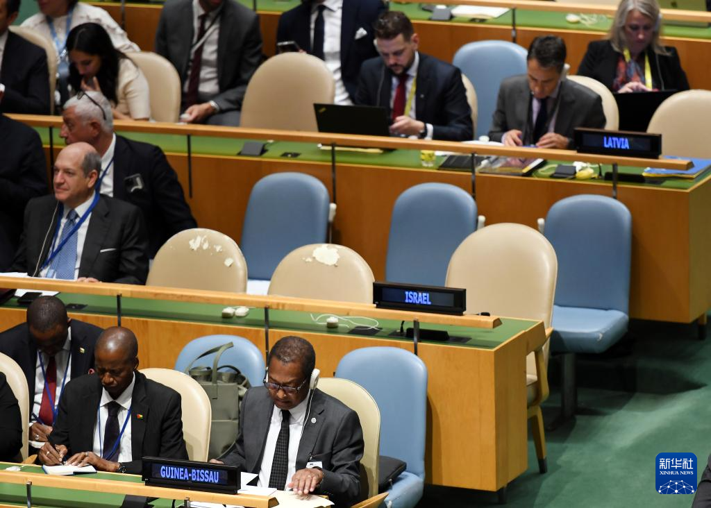 9月22日,在位于纽约的联合国总部举行的和平解决巴勒斯坦问题和落实“两国方案”高级别国际会议上,以色列代表缺席。新华社记者 李睿 摄