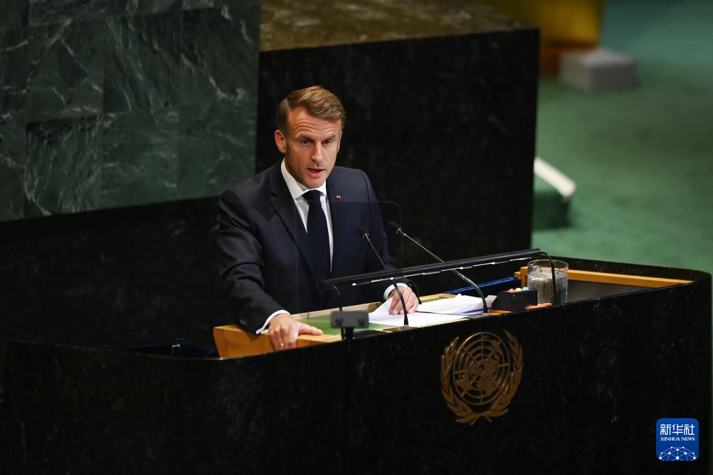 9月22日,在位于纽约的联合国总部,法国总统马克龙在和平解决巴勒斯坦问题和落实“两国方案”高级别国际会议上讲话。新华社记者 李睿 摄