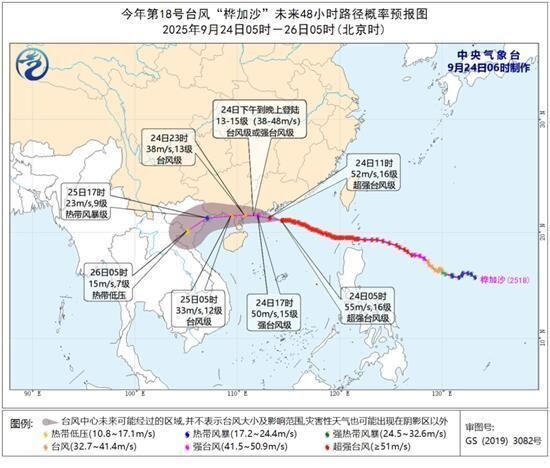 今天5时,“桦加沙”的中心位于广东省阳江市东偏南方向约255公里的南海北部海面上,将于下午到晚上在广东台山到湛江一带沿海登陆,登陆时强度可达台风级或强台风级,登陆后强度将逐渐减弱。
