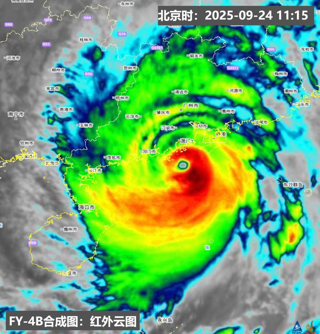 △9月24日11时15分,FY-4B静止气象卫星红外增强图显示,台风“桦加沙”位于广东南部近海,云系影响广东省大部、广西东部和海南东部。