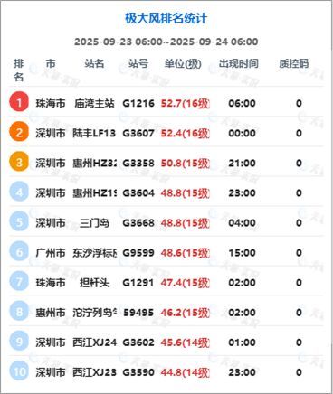 △23日06时至24日06时,广东24小时极大风最大值52.7m/s(16级),发生在广东省珠海市香洲区庙湾主站站[G1216] 。来源:广东省气象局