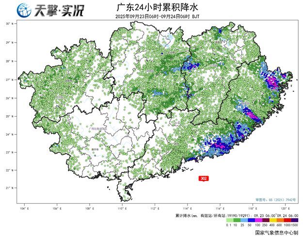 △23日06时至24日06时,广东、广西、湖南、江西、福建、贵州24小时累积降水最大值302毫米。来源:国家气象信息中心