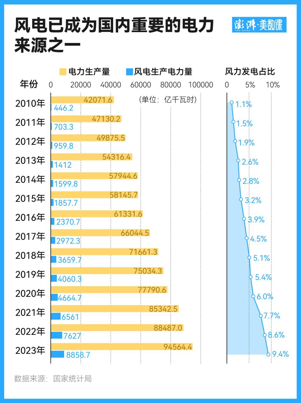 2023年,中国风电发电量达到8859亿千瓦时,占全国总发电量的9.4%。与2010年的446亿千瓦时(占比1.1%)相比,13年间增长近20倍。这一增长趋势在2024年还在延续。据国家能源局数据,2024年全国风电发电量达9916亿千瓦时,同比增长16%,全国风电平均利用率95.9%。