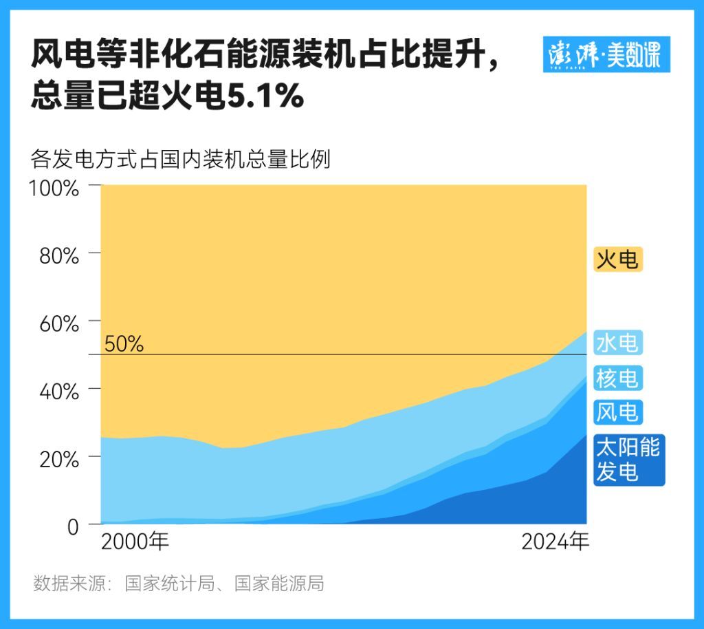 不仅是风力发电,到2023年,中国非化石能源(水电、核电、风电、太阳能)装机占比就达到了52.4%,历史上首次超过化石能源。