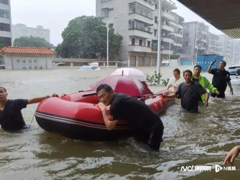 △9月24日下午,在台风“桦加沙”影响下,珠海迎风暴增水,黄杨河水位高涨,引发海水倒灌,救援人员利用皮划艇转移受困群众。