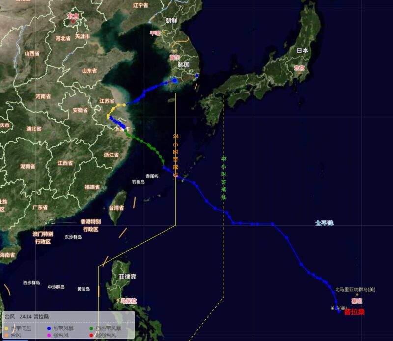 △2024年第14号台风“普拉桑”,在我国两次登陆后路径发生转折,减弱后的热带低压移入黄海后再次加强为热带风暴。图源:中国气象局