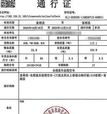近日,某物流有限责任公司向富顺县行政审批和营商环境局提交了T梁运输超限许可申请,拟从赵化镇方碑村梁场出发,经310省道、自泸大道运送货物至赵化镇龙滩村村委会,需办理超限运输许可。富顺县行政审批和营商环境局高效响应,成功为该企业办理许可,同步核发全县首张超限运输车辆通行证。