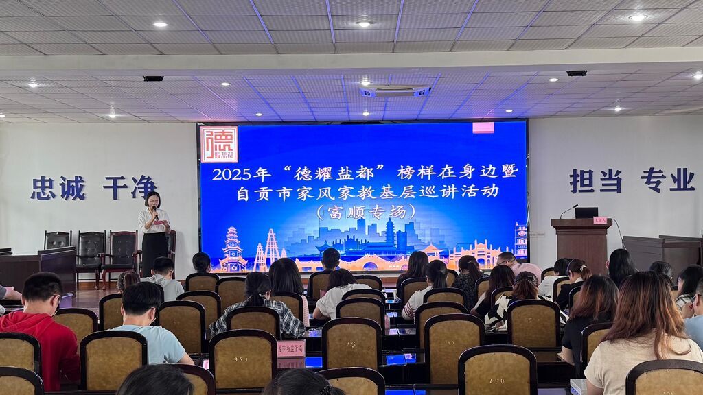 为深入弘扬优良家风家教,传递榜样力量,9月25日,2025年“德耀盐都”榜样在身边暨自贡市家风家教基层巡讲活动(富顺专场)举办。本次活动由自贡市精神文明建设办公室主办,富顺县精神文明建设办公室、富顺县市场监管局联合承办,来自市、县相关单位的代表及县市场监管局干部职工参与活动。