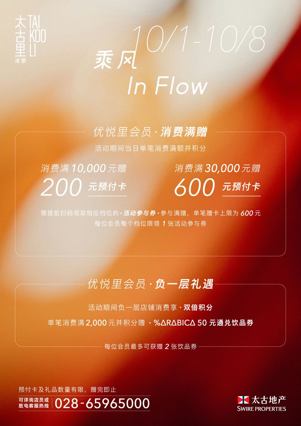 活动期间正值国庆节和中秋节,成都太古里全场近70家品牌带来新季限定单品、黄金周特推美食以及品牌日专属回馈、节庆专属消费满减、优惠福利等一系列精彩纷呈的礼遇活动。品牌日当天于指定店铺消费,“优悦里”会员尊享双倍积分福利。