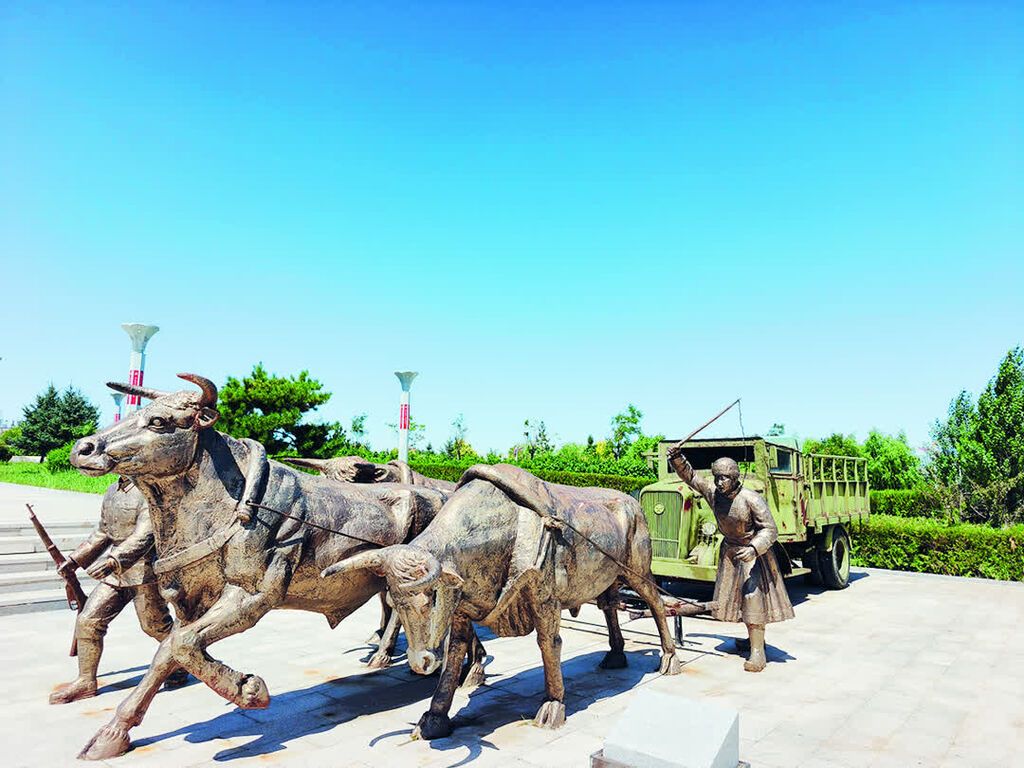 木凯淖尔镇的山梁上,“桃力民抗日根据地陈列馆”几个红色大字在骄阳下熠熠生辉,远远望去,那尊《三牛拉汽车》的雕塑静静伫立在广场中央,锈红色的金属车身爬满时光的纹路,3头耕牛弓着脊背奋力向前,牛角抵着车辕的弧度里还藏着当年的沙砾,宛如一位沉默的史官,将80多年前的烽火故事凝固成永恒的剪影。