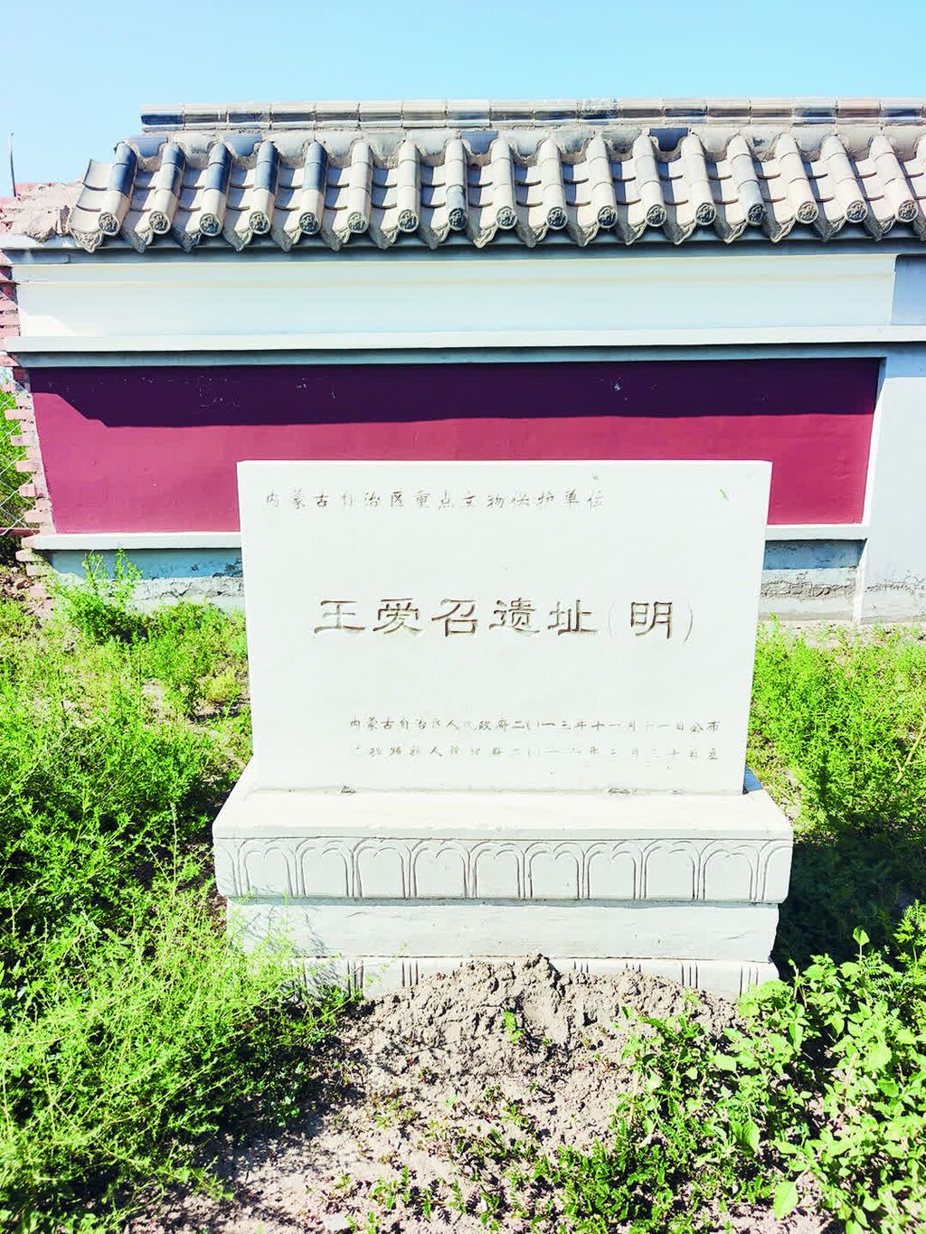 7月末,采访组一行从达拉特旗政府所在地树林召镇驱车30公里,来到了位于王爱召镇王爱召村的王爱召遗址前。眼前的遗址却只有一方宽阔的院落,院中杂草丛生,四周是新修的围墙,正面立有一座文保碑,碑身记录着王爱召于明万历三十四年兴建,清廷赐名“广慧寺”,后因鄂尔多斯领主博硕克图济农后裔受封郡王,俗称“王爱召”。原有山门、钟鼓楼、四大天王殿等,藏式建筑259间,喇嘛住房282间,居伊克昭盟寺庙之首。1941年毁于战火。通过散落在院中的残砖碎瓦和一两处断壁残垣,仍可窥见这里曾经有过寺庙建筑,可除此之外,其他地方均已是民宅,曾经辉煌的寺庙早已荡然无存。