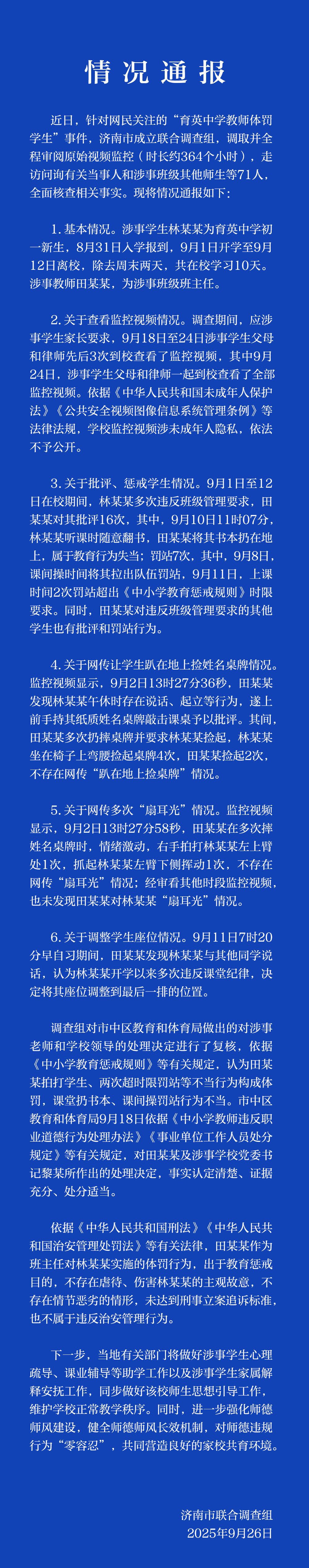 今天(26日),济南市联合调查组发布“育英中学教师体罚学生”调查结果的情况通报,全文如下: