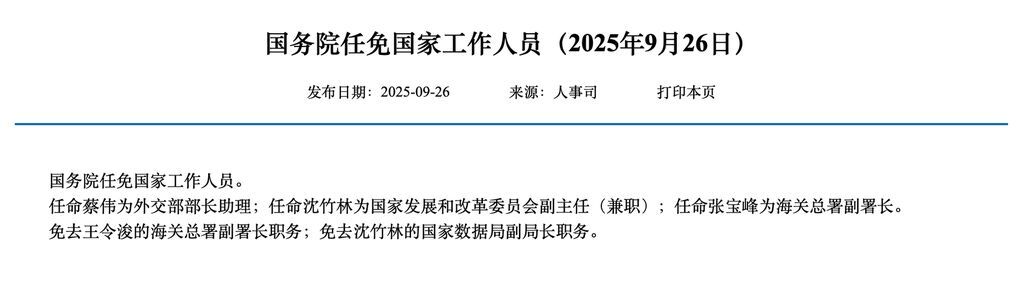 免去王令浚的海关总署副署长职务;免去沈竹林的国家数据局副局长职务。