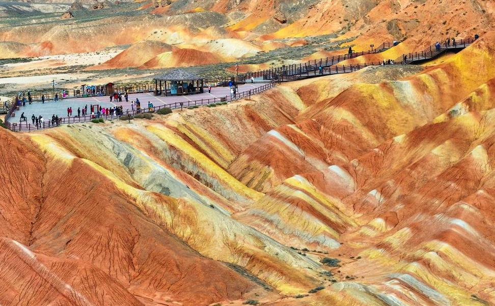 近日,雨后初霁的甘肃张掖旅游景区,七彩丹霞地貌红黄交织,宛如天然纹理画。