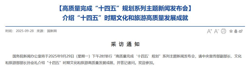 国务院新闻办公室将于2025年9月29日(星期一)下午2时举行“高质量完成‘十四五’规划”系列主题新闻发布会,请中央宣传部副部长、文化和旅游部部长孙业礼介绍“十四五”时期文化和旅游高质量发展成就,并答记者问。