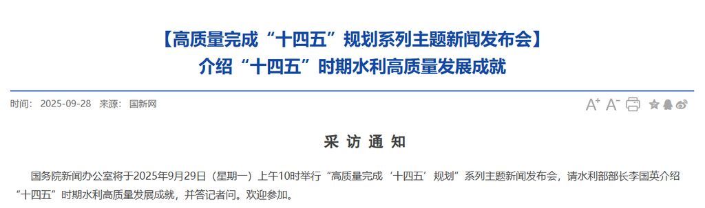 国务院新闻办公室将于2025年9月29日(星期一)上午10时举行“高质量完成‘十四五’规划”系列主题新闻发布会,请水利部部长李国英介绍“十四五”时期水利高质量发展成就,并答记者问。