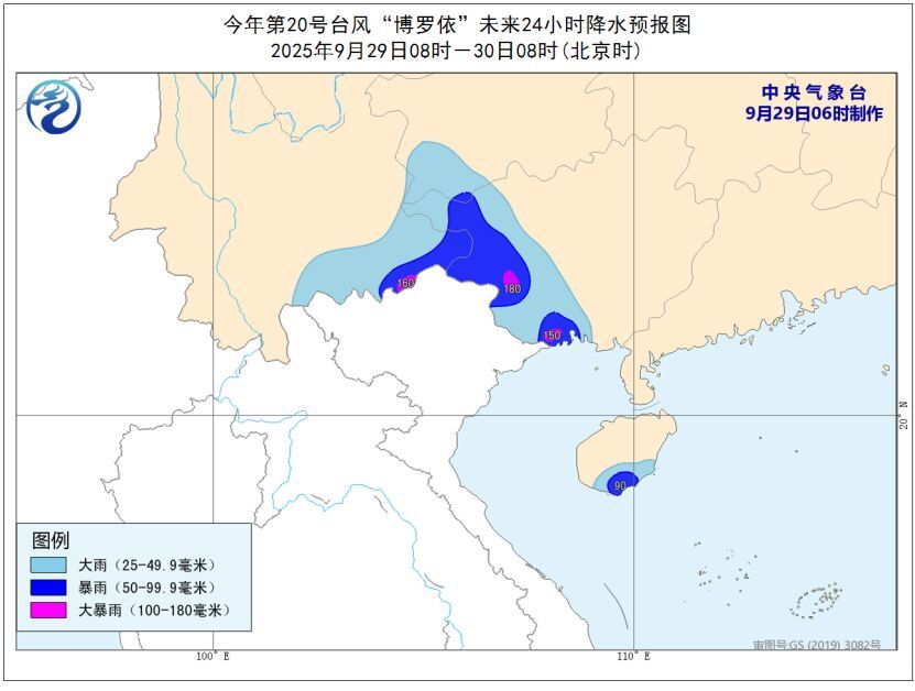 大风预报:29日8时至30日8时,南海西部、西沙群岛附近海域、北部湾、琼州海峡、广东西部沿海、海南岛及沿海、广西沿海将有6-8级、阵风9-10级的大风,其中,北部湾偏南海域的风力有9-10级、阵风11-12级。降水预报:29日8时至30日8时,海南岛南部、广西西部、云南东南部、贵州南部等地有大到暴雨,其中,广西西南部、云南东南部等地部分地区有大暴雨(100~180毫米)。
