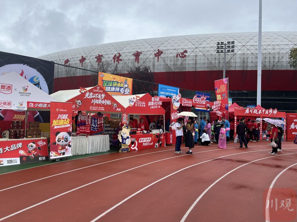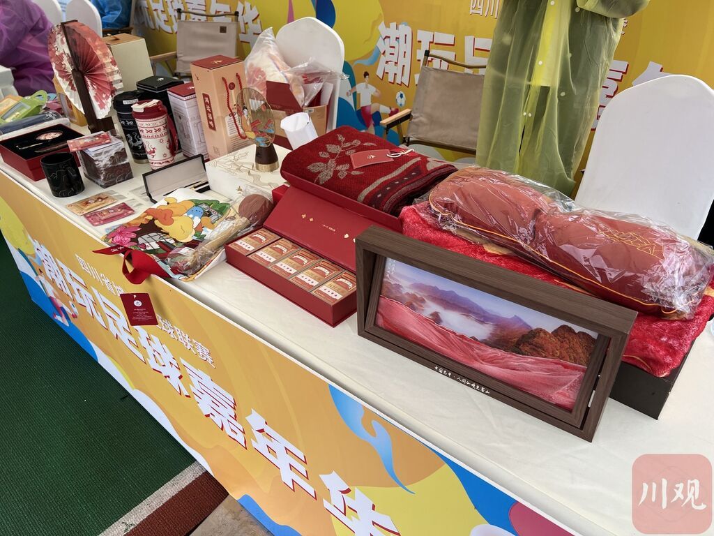 一旁,四川老廖家风味食品有限公司的展位也吸引了不少球迷。“大家对我们的牛肉干、牛肉丝、卤牛肉都比较感兴趣,一开摊就卖出去好几袋。”该公司电商工作人员石巧灵说。