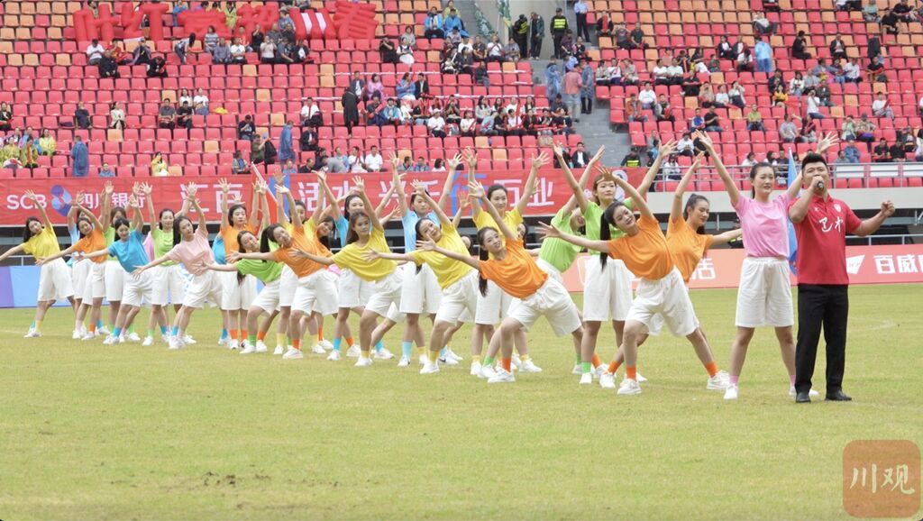 在嘉年华内,还安排了乐队驻唱,耳熟能详的歌曲让台下球迷积极跟唱,现场气氛热烈。在赛场内,巴中市还精心策划了歌舞表演《走巴山》、啦啦操《我们都是追梦人》、通江民歌《送红军》、四川车灯《打亲家》等文艺节目,赢得观众阵阵掌声。