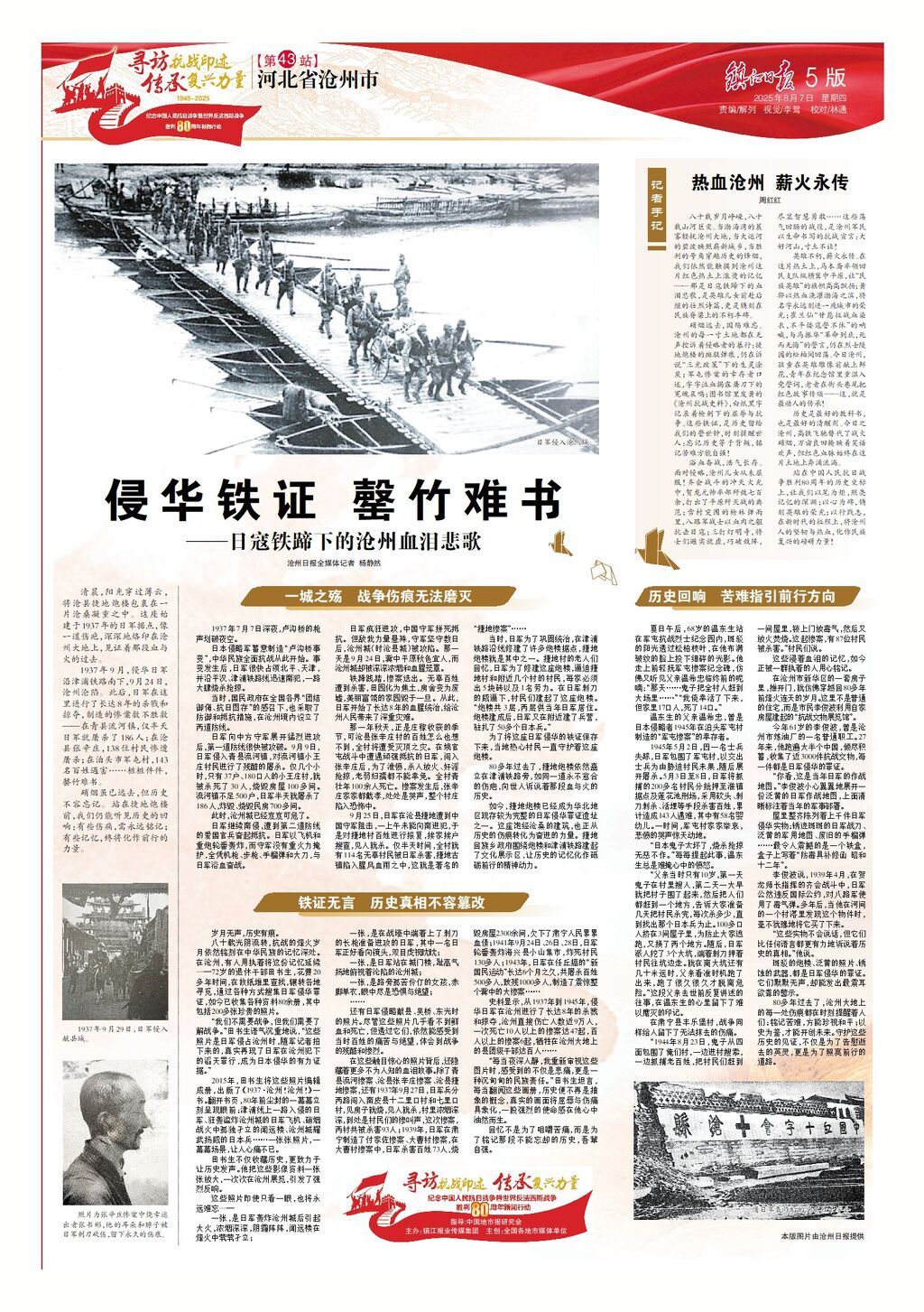 1937年9月,侵华日军沿津浦铁路南下,9月24日,沧州沦陷。此后,日军在这里进行了长达8年的杀戮和掠夺,制造的惨案数不胜数——在青县流河镇,仅半天日军就屠杀了186人;在沧县张辛庄,138位村民惨遭屠杀;在泊头市军屯村,143名百姓遇害……桩桩件件,罄竹难书。