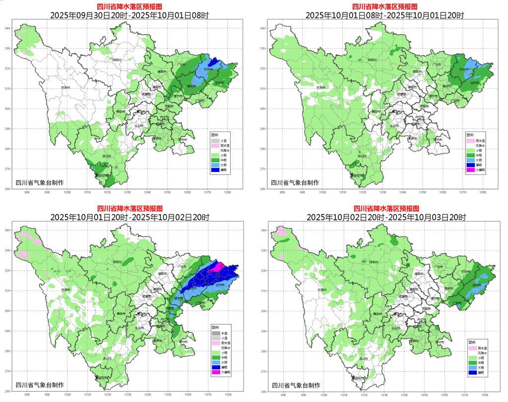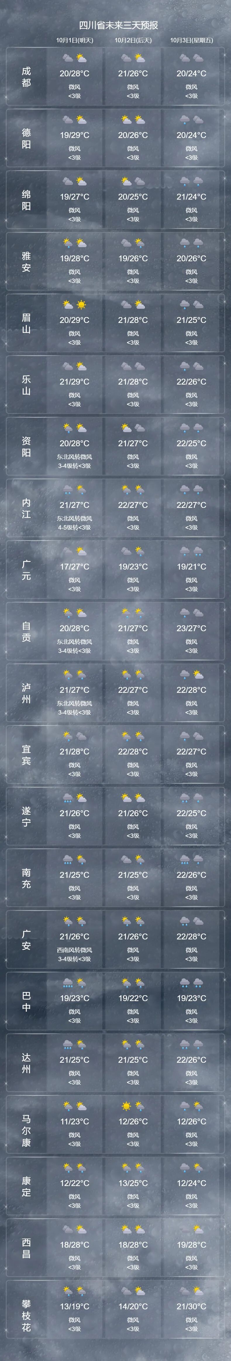 ·10月1日晚上到2日白天,盆地东部阴天有阵雨或雷雨,雨量普遍小到中雨,其中巴中、达州、南充3市和遂宁、资阳、内江3市东部有大雨到暴雨,局地大暴雨,盆地其余地方以多云天气为主;川西高原和攀西地区大部多云间阴有分散阵雨或雷雨,局地中雨,高海拔地区有雨夹雪或小雪。