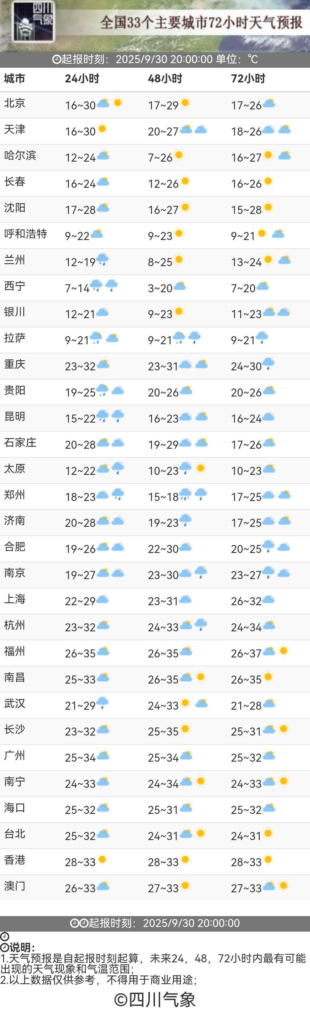 ·明天(10月1日)白天,盆地大部阴天间多云,北部和西部沿山有阵雨或雷雨,其中达州、巴中2市有中到大雨;川西高原和攀西地区大部阴天间多云有阵雨或雷雨,局地中雨。