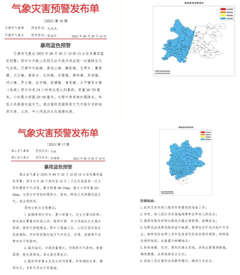 注意,截至记者9月30日晚发稿,巴中市通江县、达州万源市发布了暴雨蓝色预警。