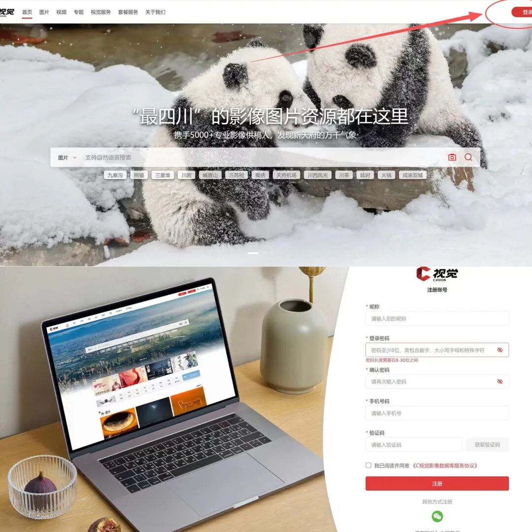 入口三:请在“C视觉”影像数据库官网(https://www.scph.cn)登录并申请成为签约供稿人后,点击官网右上角“上传”即可投稿。