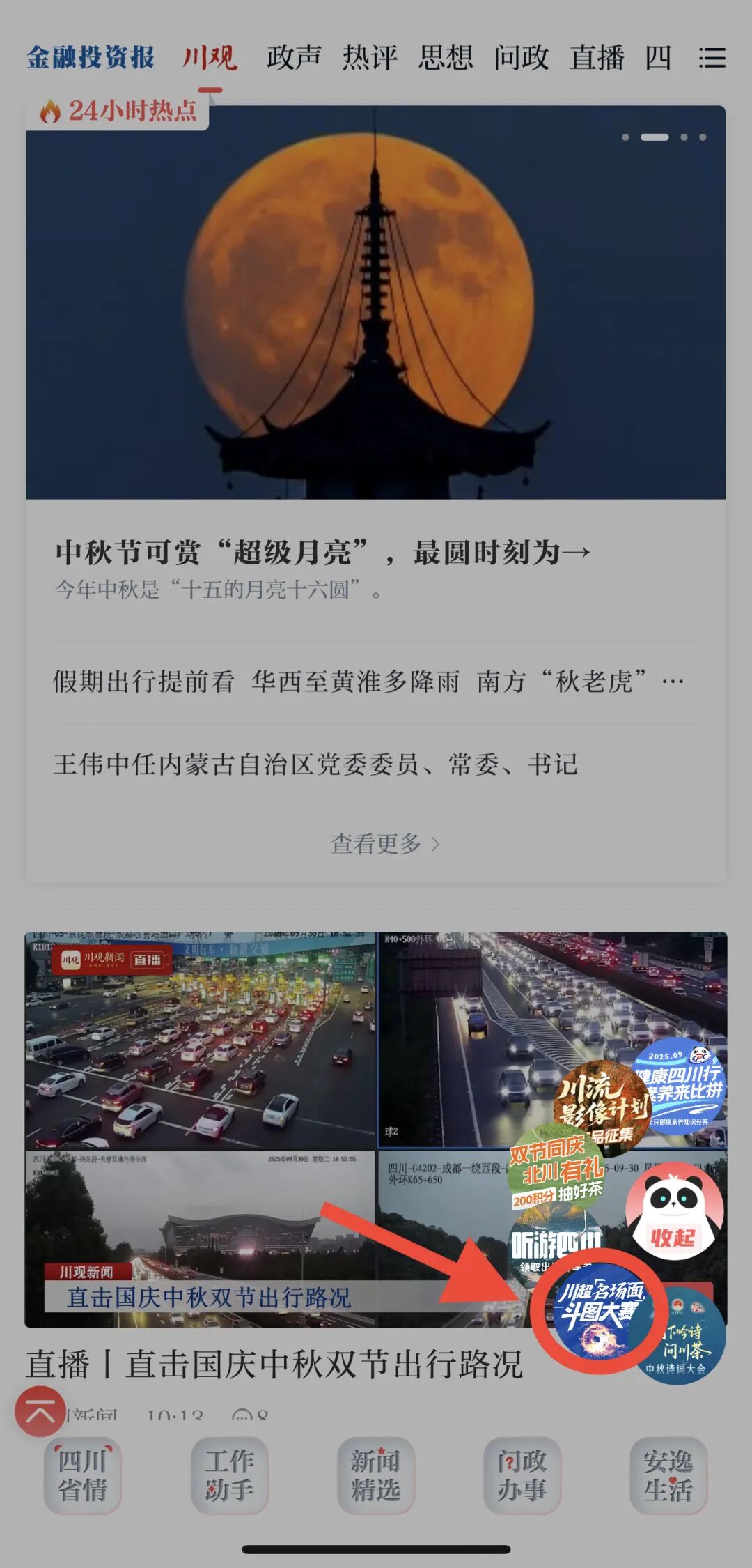 入口一:打开川观新闻App,首页右下角悬浮球选择“斗图大赛”按钮,点击进入活动。