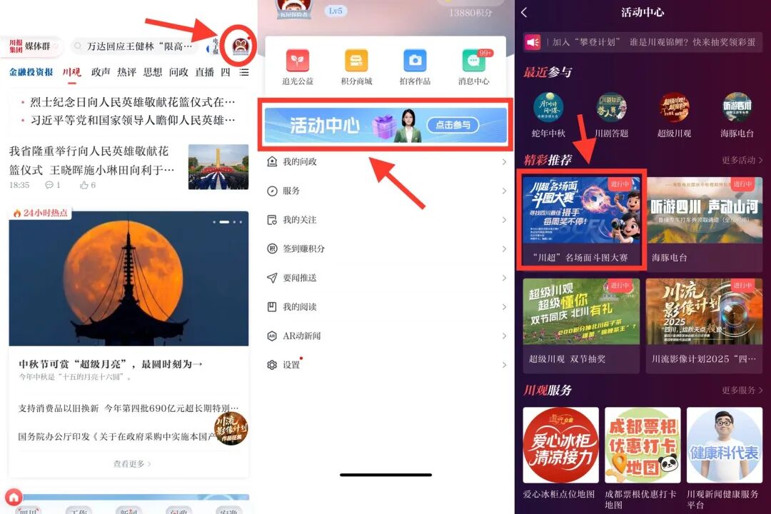 入口二:打开川观新闻App,点击首页右上角头像选择“活动中心”,进入选择“斗图大赛”按钮,点击进入活动。